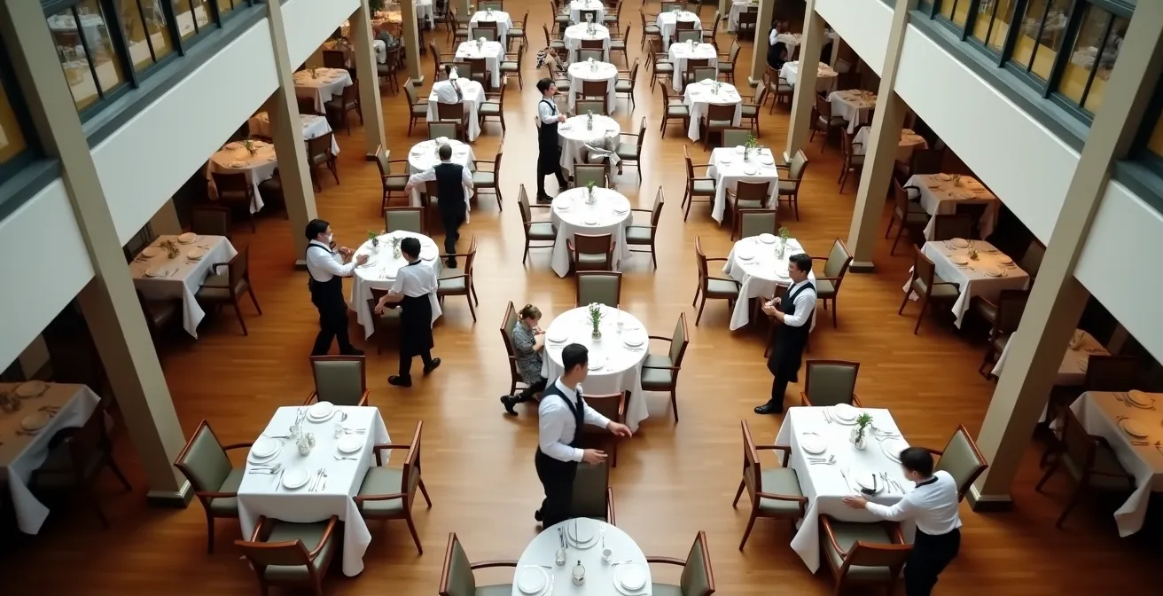 Un service de 100 couverts ou plus est un test de résistance pour n’importe quelle organisation. Sans une standardisation poussée des flux et des rôles, le service le plus prometteur peut rapidement sombrer dans le chaos. La clé n’est pas de « courir plus vite », mais d’avoir des protocoles spécifiques qui se déclenchent en fonction du niveau d’affluence. Le rôle du manager change alors radicalement : il n’est plus un « super-serveur » qui aide ponctuellement, mais une véritable tour de contrôle. Sa position devient centrale, son objectif unique est d’observer, de coordonner et de piloter les flux (clients entrants, plats sortants, personnel en mouvement).